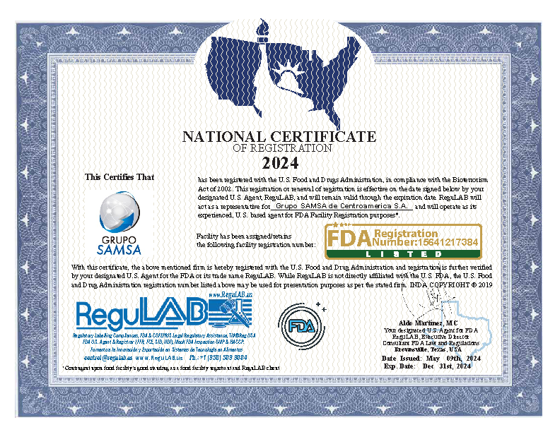 We are pleased to inform you that we have fulfilled a fundamental requirement by obtaining both FDA and PYME certifications. The FDA certification allows us to export our products to the United States, as it is an imperative requirement.